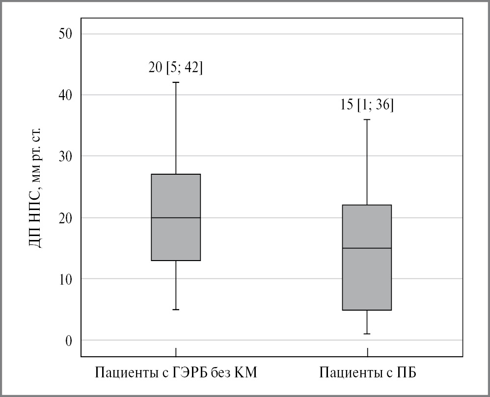 В исследовании M. Vaezi и J. Richter также продемонстрировано, что снижение ДП НПС, нарушение перистальтики грудного отдела пищевода и удлинение времени экспозиции патологического ГЭР у пациентов с ГЭРБ, осложненной КМ, встречалось чаще, чем у пациентов с ГЭРБ без КМ [29]. Известно, что у больных рефлюкс-эзофагитом патологический ГЭР развивается вследствие снижения ДП НПС. При этом существуют исследования, демонстрирующие нормальное ДП НПС у пациентов с ГЭРБ. В этом случае механизм развития ГЭРБ может быть обусловлен нарушением моторно-эвакуаторной функции органов желудочно-кишечного тракта или высоким внутрибрюшным давлением [30].