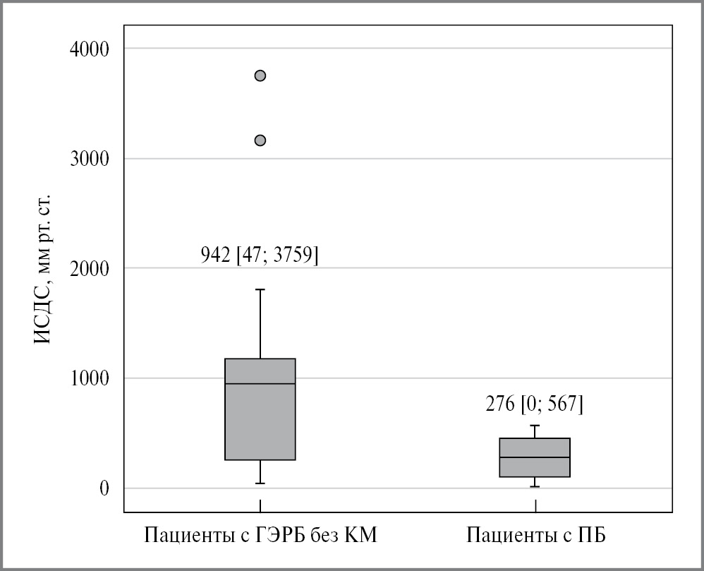 Результаты. В ходе исследования обнаружено, что у пациентов с ГЭРБ, осложненной КМ, жалобы на интенсивную изжогу и затруднения при глотании возникали чаще, чем у пациентов с ГЭРБ без КМ. Согласно данным манометрии, давление покоя нижнего пищеводного сфинктера у пациентов с ГЭРБ и КМ (15,1 [1,3; 36,4] мм рт. ст.) оказалось ниже, чем у пациентов с ГЭРБ без КМ (20,3 [5,5; 42,1] мм рт. ст.). Это различие статистически значимо (р = 0,002). У пациентов с ГЭРБ и КМ моторика пищевода менее эффективна: это выражалось в снижении интегральной сократимости дистального сегмента пищевода до 276,5 [0,2; 567,7] мм рт. ст. × с × см, в то время как у пациентов с ГЭРБ без КМ этот показатель значительно выше: 942,5 [47,3; 3759,7] мм рт. ст. × с × см. Затруднения при глотании сопровождались снижением эффективности моторики пищевода. У пациентов с ГЭРБ, осложненной КМ, наблюдалось большее количество кислых гастроэзофагеальных рефлюксов по сравнению с пациентами без КМ (72,5 [53,5; 91,5] против 54,2 [29,9; 78,3]; р = 0,036). Также у них больше процент времени с рН < 4,0 в пищеводе (14,5 [9,7; 19,3] против 10,3 [5,6; 14,9]; р = 0,028) и более высокие значения индекса DeMeester (35,4 [1,9; 114,5] против 15,1 [0,2; 47,7]; р = 0,004).