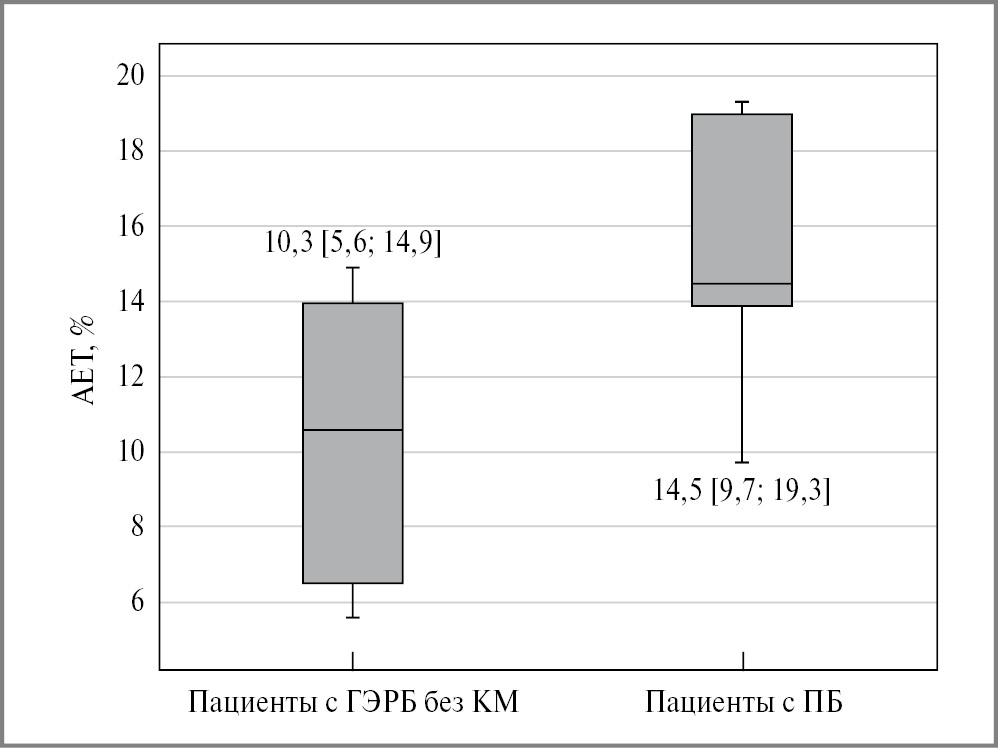 По результатам суточной рН-метрии количество кислых ГЭР у пациентов с ГЭРБ, осложненной развитием ПБ (72,5 [53, 5; 91, 5]), достоверно больше, чем у пациентов без КМ (54,2 [29, 9; 78, 3]; р = 0,036). АЕТ у пациентов с ПБ (14,5 [9, 7; 19, 3]) больше, чем у пациентов без КМ (10,3 [5, 6; 14, 9]; р = 0,028); рис. 3. Особое внимание обращает изменение индекса DeMeester, который отражает суммарное воздействие кислого рефлюктата на слизистую пищевода. Он ожидаемо превышал референсные значения (< 14,72) в обеих группах, однако в группе пациентов с ПБ индекс DeMeester значительно достоверно больше, чем в группе ГЭРБ без КМ (35,4 [1, 9; 114, 5] vs 15,1 [0, 2; 47, 7]; р = 0,004); табл. 2.