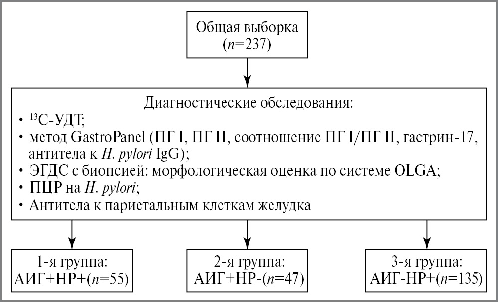 По результатам обследования в соответствии с алгоритмом, представленным на рис. 1, в исследование включены 237 пациентов с последующим формированием 3 групп из этой когорты: АИГ+НР+, АИГ+НР-, АИГ-НР+.