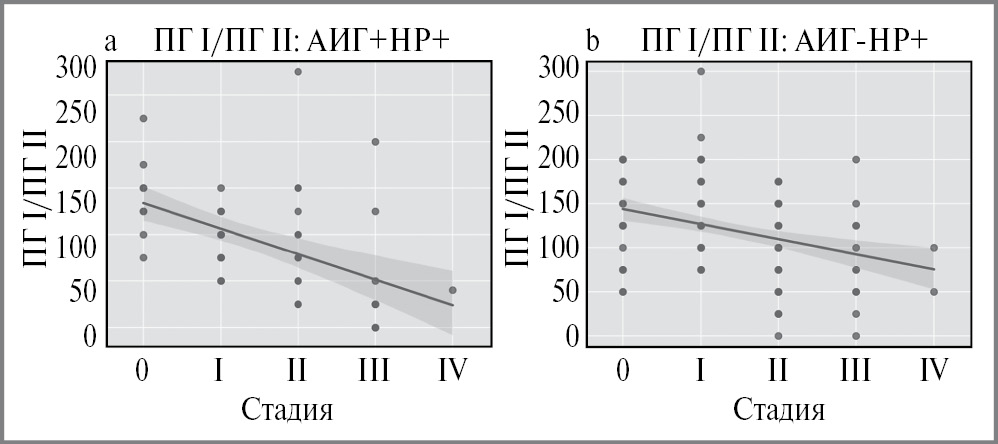 Рис. 2. Статистически значимая медиана между средним уровнем соотношения ПГ I/ПГ II в зависимости от стадии атрофии в группах АИГ+НР+ (а) и АИГ-НР+ (b).