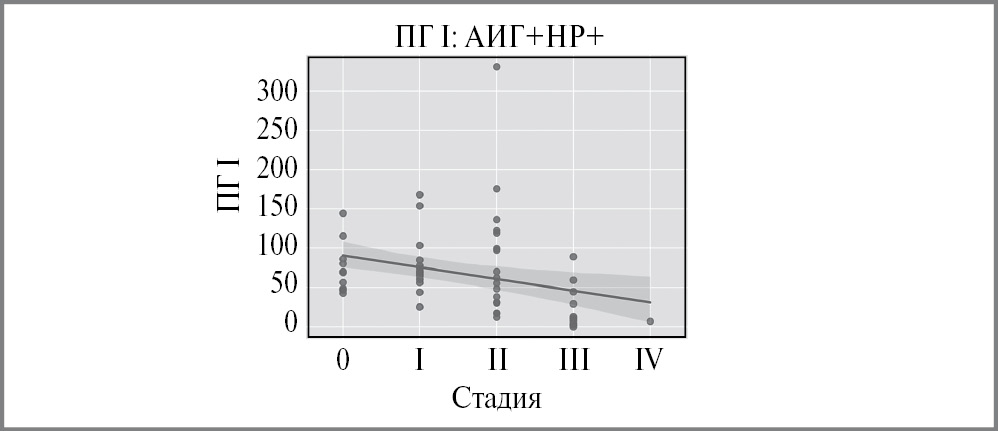 У пациентов с инфекцией H. pylori мы чаще наблюдали нормальные показатели СПГ и 0–I–II стадию атрофии, вероятно, из-за исходного поражения антрального отдела и интактного тела желудка. Что касается средних значений соотношения ПГ I/ПГ II и их корреляции со стадией атрофии, мы выявили статистически значимую медиану в группах АИГ+НР+ и АИГ-НР+, по всей вероятности, за счет персистирования инфекции Н. pylori и вовлечения в патологический процесс антрального отдела желудка, из-за чего происходит «утяжеление» стадии атрофии. Однако существуют небольшие отличия при оценке средних значений ПГ I. Корреляционную связь наблюдали только в группе АИГ+НР+, что позволяет сделать вывод о более чувствительном показателе соотношения ПГ I/ПГ II и дискутировать о показателе порогового значения для ПГ I.