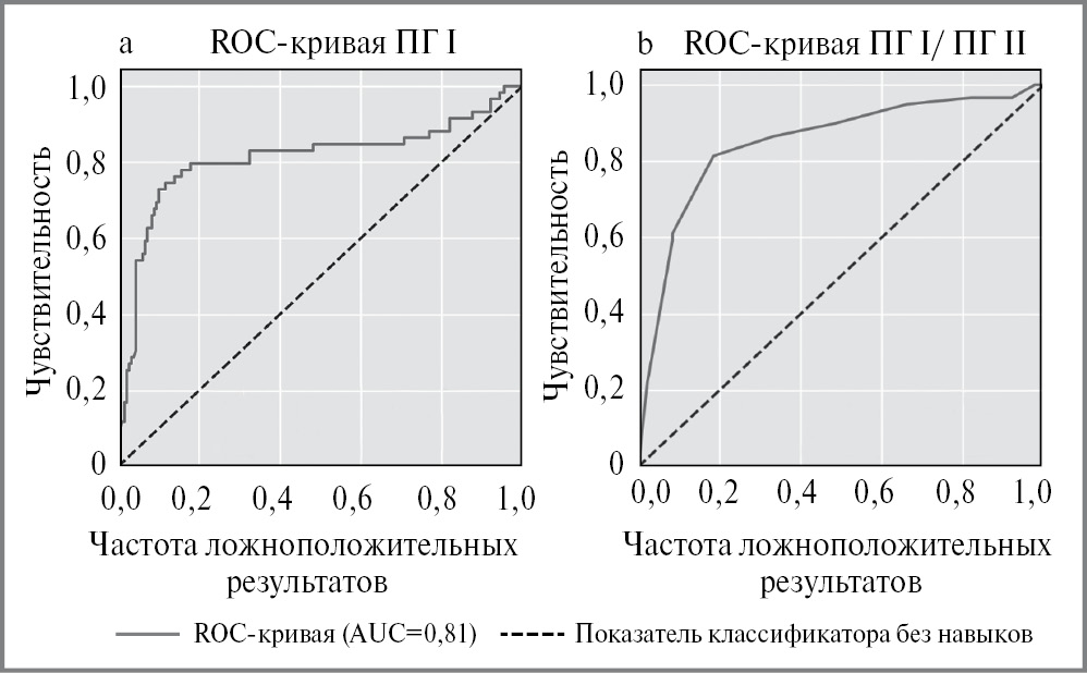 На рис. 4 показана ROC-кривая для ПГ I (a) и ПГ I/ПГ II (b) относительно OLGA III–IV стадии. Выявлена высокая связь между ПГ I и тяжестью атрофии (AUC = 0,81) и отношением ПГ I/ПГ II (AUC = 0,85).