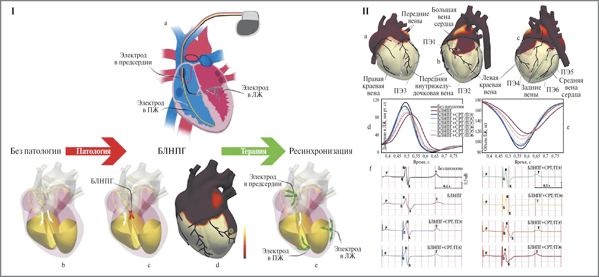 Рис. 1. Диссинхрония миокарда и работа сердечного ресинхронизирующего устройства. I: а – схематичное изображение бивентрикулярного стимулятора с предсердным (красный), правожелудочковым (желтый) и левожелудочковым (зеленый) электродами; b – схематичное изображение распространения электрического импульса по проводящей системе сердца; с – уровень БЛНПГ; d – распределение потенциала активации в миокарде. Зеленой точкой указана оптимальная вена для позиционирования электрода; е – бивентрикулярная стимуляция. II: а–с – различные положения левожелудочкового электрода; d – динамика давления в ЛЖ во время систолы; e – динамика объема ЛЖ во время систолы; f – конфигурации QRS-комплекса при различных векторах стимуляции (aдаптировано из F. Viola и соавт., 2023 [10]).