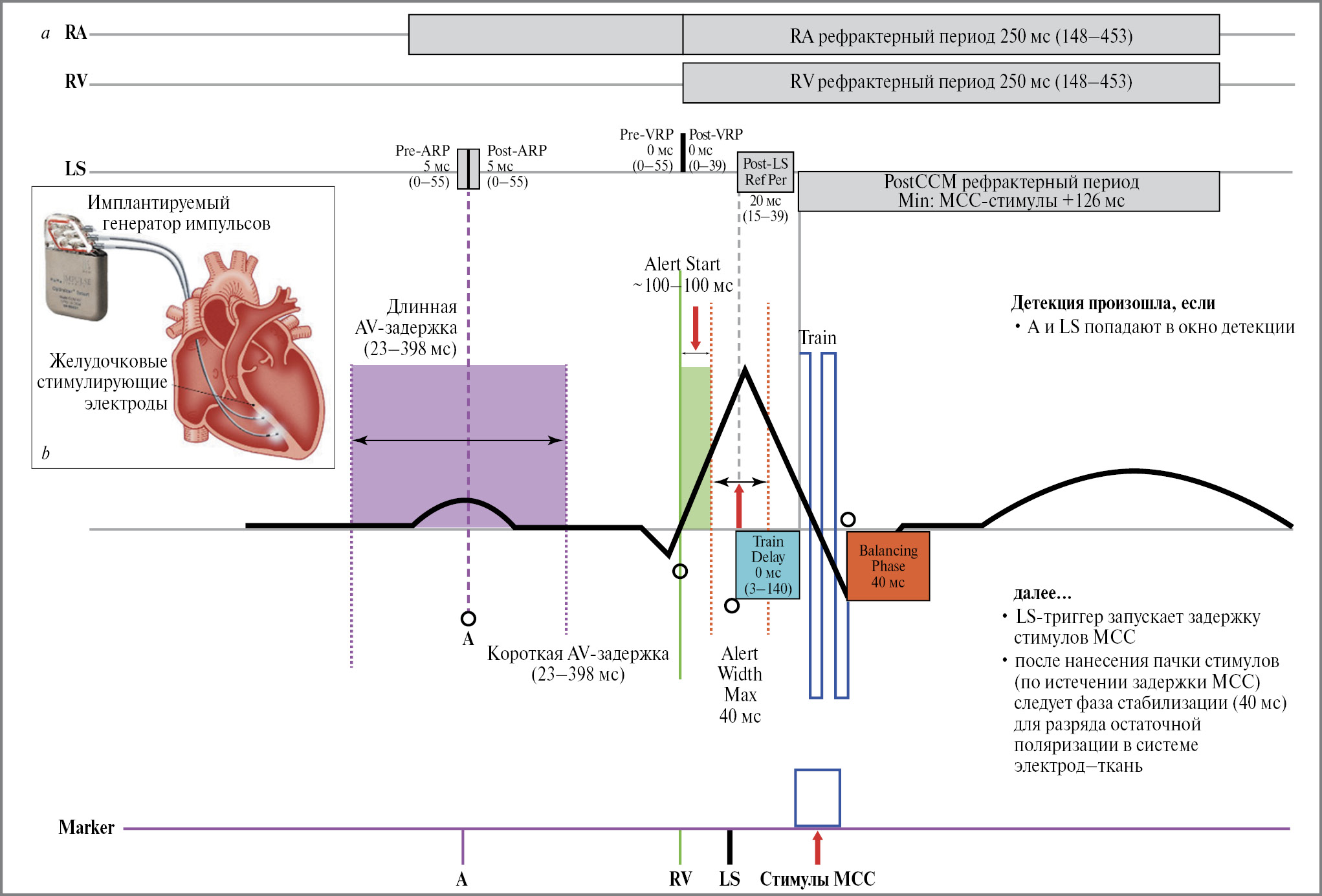 Рис. 2. Система модуляции сердечной сократимости: составляющие системы и тайминг нанесения стимула: a – основной принцип стимуляции модулятора сердечной сократимости; b – составляющие системы МСС-терапии (рис. составлен авторским коллективом).