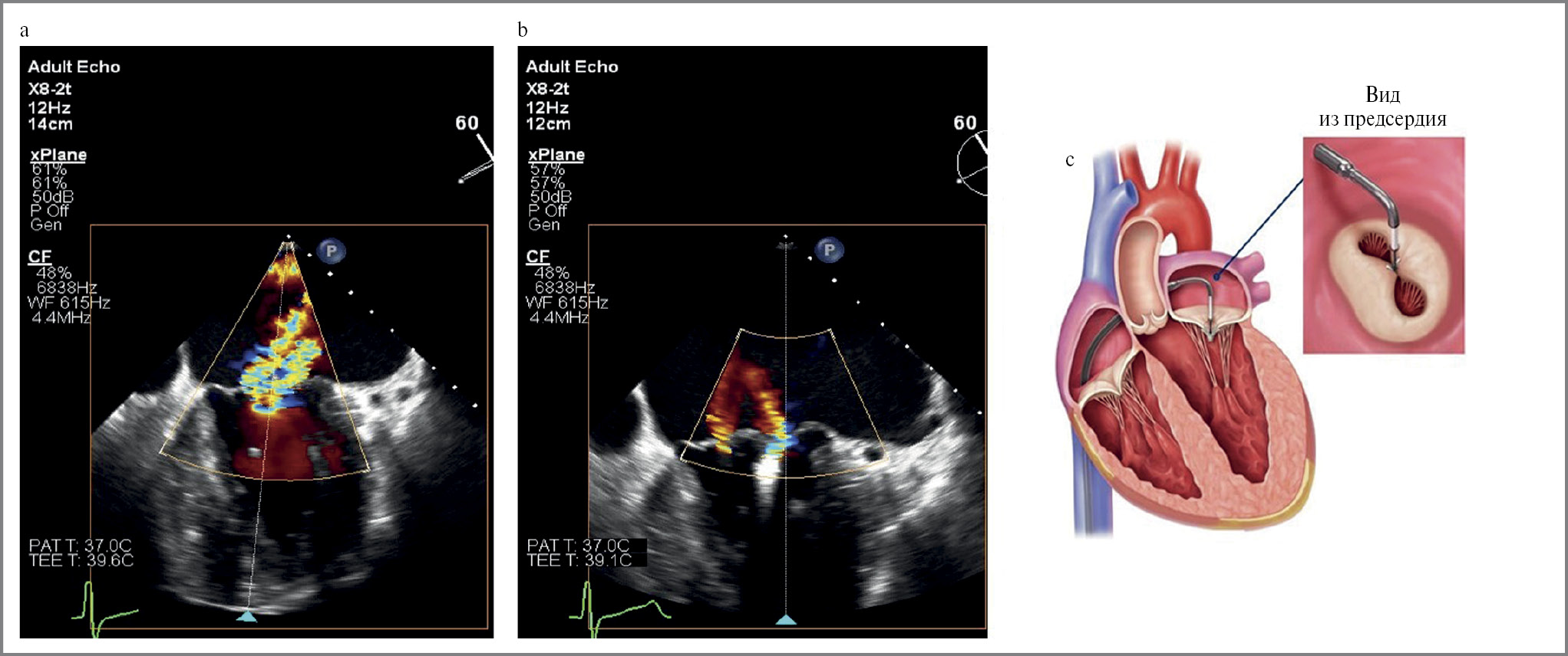 Рис. 5. Транскатетерная пластика митрального клапана «край-в-край»: a – митральная недостаточность 3–4-й степени; b – корректированная митральная недостаточность (архив ФГБУ «НМИЦК им. акад. Е.И. Чазова»); c – схематичное изображение наложения клипсы на створки МК.