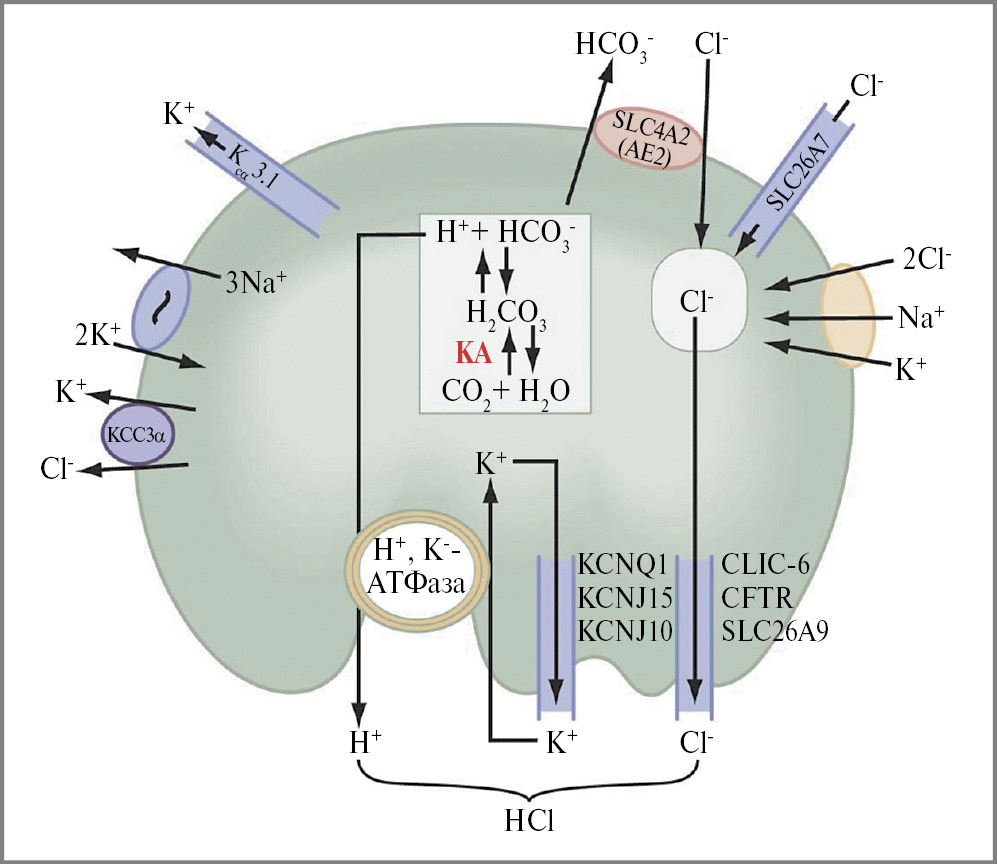 Париетальная клетка обеспечивает секрецию соляной кислоты за счет скоординирированной работы нескольких ионных транспортных механизмов. Центральное место занимает Н+, К+-АТФаза, осуществляющая обмен H+ и K+ через апикальную мембрану (рис. 1) [3, 9, 10]. Однако для формирования полноценного секрета необходим также выход Cl-, что обеспечивается Cl--каналами (CLIC-6, CFTR, SLC26A9) и К+-каналами (KCNQ1, KCNJ15, KCNJ10), поддерживающими ионный баланс в просвете секреторных канальцев [1, 4, 11–13]. В результате в просвет выделяются H+ и Cl-, образуя HCl, а K+ рециклируется между клеткой и внешней средой [1, 2, 5, 6, 9]. Поступление Cl- в клетку осуществляется через антипортер SLC4A2 (обмен HCO3-/Cl-) и другие транспортеры базолатеральной мембраны – NKCC1 и канал SLC26A7 [1, 14, 15]. HCO₃- синтезируется под действием карбоангидразы, использующей CO2 как исходный субстрат [3, 9, 10]. Протон формируется из воды, при этом наличие буферных систем предотвращает ощелачивание цитозоля [5]. В ходе недавних исследований на базолатеральной мембране париетальных клеток идентифицированы К+-экспортеры, подавляющие кислотопродукцию: электронейтральный K+/Cl--котранспортер (KCC3α) и кальций-активируемый К+-канал промежуточной проводимости (Kcα3.1) [16, 17].
