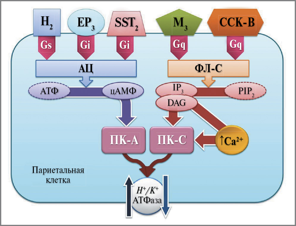Выделяют 3 фазы желудочной секреции: цефалическую, желудочную и кишечную. Цефалическая фаза запускается под влиянием запаха и вида пищи, с активацией парасимпатической иннервации и высвобождением ацетилхолина из постганглионарных холинергических нейронов [1, 3, 18]. Желудочная фаза начинается при поступлении пищи в желудок и активации механорецепторов. Ответный сигнал через блуждающий нерв усиливает секрецию, а также активируются гуморальные и паракринные стимулы – гастрин (G-клетки) и гистамин (ECL-клетки) [3, 9, 19]. Кишечная фаза возникает при эвакуации химуса в двенадцатиперстную кишку. При снижении рН ниже 4 активируется симпатическая система, подавляющая секрецию; медиатором здесь выступает норадреналин [3, 19]. Секреторная активность париетальных клеток регулируется нейральными, гормональными и паракринными влияниями [1, 3, 18]. Основные стимуляторы – ацетилхолин, гистамин и гастрин; основные ингибиторы – соматостатин и простагландины Е2 и I2 [3, 4, 9, 10, 18]. Под действием стимулов клетка переходит от состояния покоя к активной секреции [1–3, 5]. Ацетилхолин, высвобождаемый из холинергических окончаний, связывается с M3-рецепторами на париетальной клетке. Этот рецептор сопряжен с Gq-белком, активирующим фосфолипазу С и запускающим расщепление PIP2 на IP3 и DAG (рис. 2) [1, 3, 18, 19]. IP3 увеличивает уровень Ca2+, а DAG активирует протеинкиназу С, что усиливает секреторную активность [1, 2, 4, 5, 9]. Дополнительно ацетилхолин стимулирует ECL-клетки через M1-рецепторы, вызывая высвобождение гистамина [2, 5, 10]. Гистамин выделяется ECL-клетками и действует локально, связываясь с H2-рецепторами на париетальной клетке [2]. Эти рецепторы сопряжены с Gs-белком, активирующим аденилатциклазу и усиливающим продукцию циклического аденозинмонофосфата – вторичного мессенджера, который запускает каскад через протеинкиназу A [1, 5, 9, 10, 18]. Последняя модулирует цитоскелетные белки, включая эзрин, участвующий в ремоделировании апикальной мембраны при активации секреции [20]. Кроме того, гистамин влияет и опосредованно, взаимодействуя с H3-рецепторами D-клеток [21]. Гастрин синтезируется G-клетками антрального отдела желудка в ответ на стимуляцию компонентами пищи, поступает в париетальные клетки с током крови и активирует CCK-B-рецепторы на их базолатеральной мембране [1, 2, 4, 5, 9]. Он также стимулирует ECL-клетки через те же рецепторы, усиливая выделение гистамина [1, 3, 4, 18, 19]. Сигнальный каскад при активации CCK-B-рецепторов аналогичен пути M3-холинорецепторов с участием Gq-белка, IP3, DAG и внутриклеточного кальция [7, 22]. Таким образом, указанные механизмы, от рецепторов до вторичных мессенджеров, представляют собой важные терапевтические мишени при создании и применении антисекреторных препаратов [2].