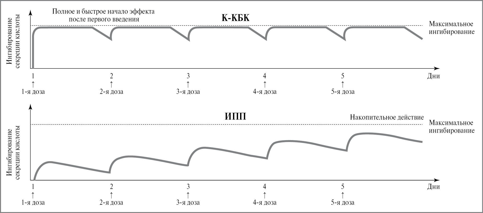 В отличие от ИПП, кислотоподавляющий эффект которых обусловлен ковалентным необратимым связыванием с протонной помпой париетальных клеток, К-КБК конкурентно обратимо взаимодействуют с ионным К+-связывающим доменом H+, K+-АТФазы (табл. 2) [22, 26, 27]. После связывания К-КБК блокируют доступ ионов K+ к протонному насосу. В отличие от ИПП, К-КБК кислотоустойчивы и, следовательно, не требуют кишечнорастворимой оболочки [29]. Стандартные ИПП представляют собой форму пролекарства, которая требует присоединения протона для трансформации в активную форму. Для осуществления процесса протонирования ИПП должны находиться в париетальных клетках, в которых секреция кислоты должна быть активирована после приема пищи. С учетом времени, требуемого для этого процесса, такие препараты необходимо принимать за 30 мин до приема пищи для оптимального эффекта. К-КБК можно принимать независимо от приема пищи, и пища не влияет на скорость их всасывания [30]. Кроме того, К-КБК не являются пролекарствами и действуют непосредственно на протонный насос. Эти различия в механизме действия К-КБК способствуют более быстрому достижению пиковых концентраций в плазме и началу действия [30]. При этом для К-КБК активация в кислой среде не требуется, что обусловливает более высокую скорость ингибирования секреции соляной кислоты при сравнении с ИПП (рис. 3) [30, 31].