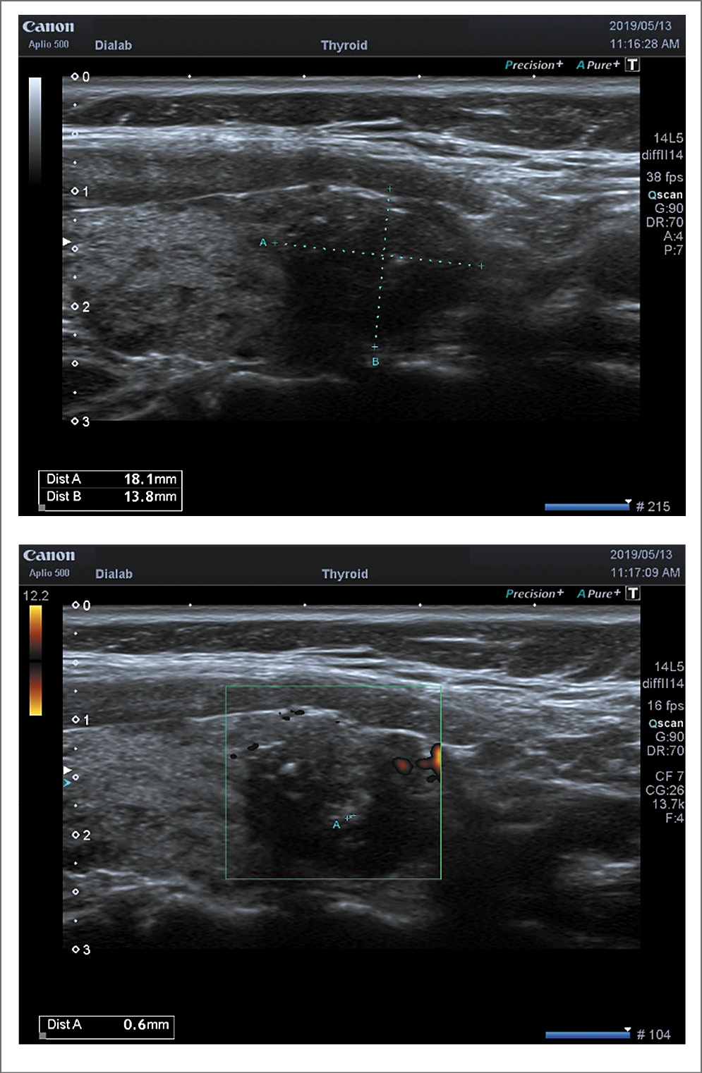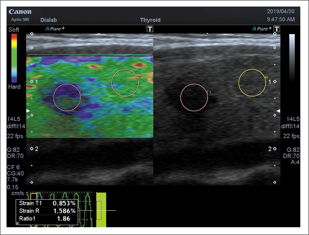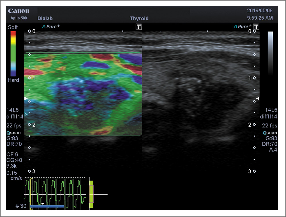УЗИ проводилось на аппаратах Toshiba Aplio-400 и Toshiba Aplio-500 (Япония) стандартным методом и с применением эластографии. Использовался поверхностный датчик с частотой 10–14 МГц. Проводился анализ ультразвукового изображения ЩЖ по системе TI-RADS. Режим эластографии (компрессионная эластография и эластография сдвиговой волной – Shear Wave Elasticity Imaging – SWEI) использовался после сканирования в серошкальном и допплерографических режимах. Измерения проводились в одинаковых по размерам зонах интереса (Q-box); узел – окружающая паренхима. Для качественной оценки различной эластографической картины очагов в ЩЖ нами применялась система оценки по визуальной стандартизированной системе Tsukuba–Ueno (2006 г.) [22].