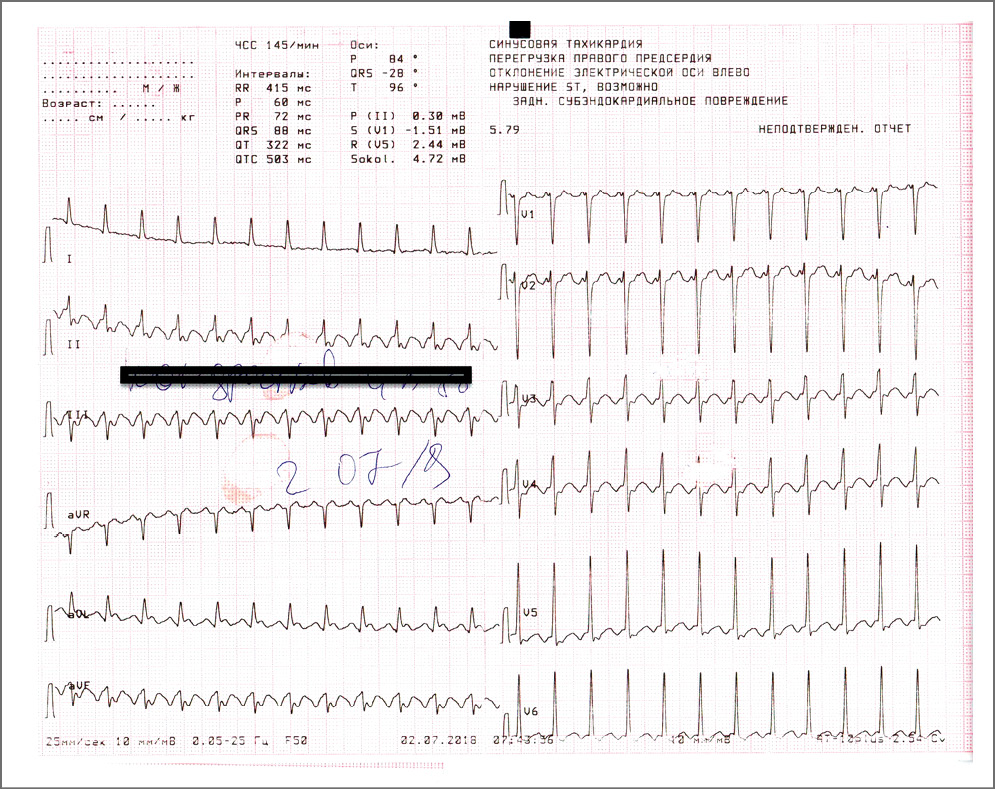 При поступлении в ГБУЗ «ГКБ №1 им. Н.И. Пирогова» состояние пациента расценено как тяжелое. Кожный покров землистого цвета, холодный на ощупь – признаки централизации кровотока. Отеки голеней, стоп. Частота дыхательных движений – 35 в минуту, инспираторная одышка. Сатурация кислорода на атмоферном воздухе 92%. Тоны сердца глухие, ритм правильный. Пульс на магистральных артериях слабого наполнения, пульс на периферических артериях нитевидный. Артериальное давление (АД) 90/40 мм рт. ст.; ЧСС 78 уд/мин. Живот мягкий, увеличен в объеме за счет асцита. Печень увеличена, выступает из-под края реберной дуга на 2 см. По мочевому катетеру мочи не получено. ЭКГ при поступлении – синусовый ритм (рис. 1).