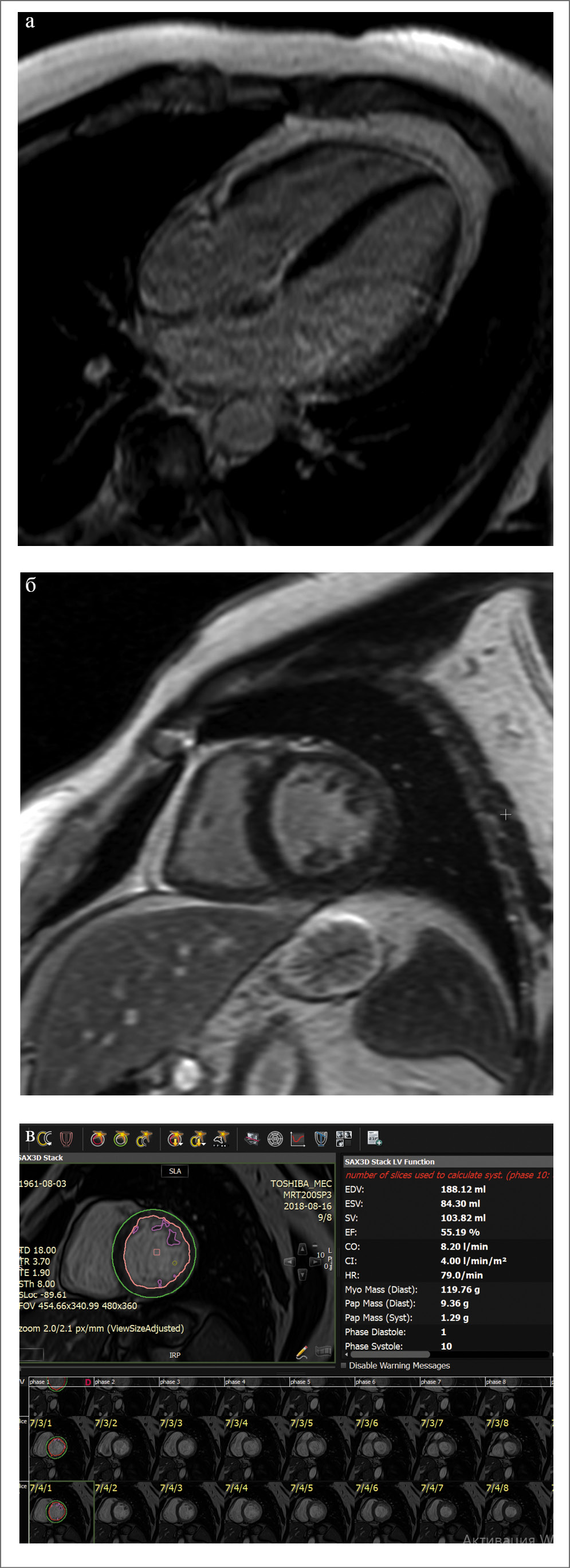 Рис. 5. МРТ сердца: а, б – отсутствие отсроченного контрастирования, в – сохранная ФВ