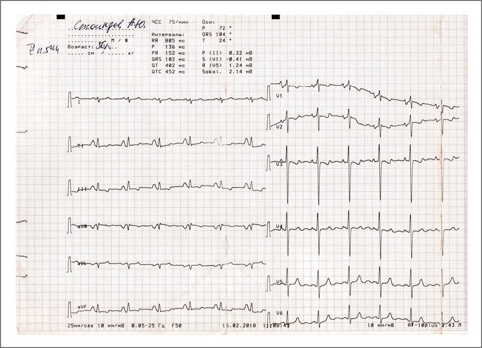Рис. 2. ЭКГ: ритм синусовый, ЧСС – 76 уд/мин. Отклонение электрической оси сердца вправо. Признаки перегрузки правых отделов сердца, увеличения обоих предсердий и ПЖ (высокие зубцы R в V1–V2)
