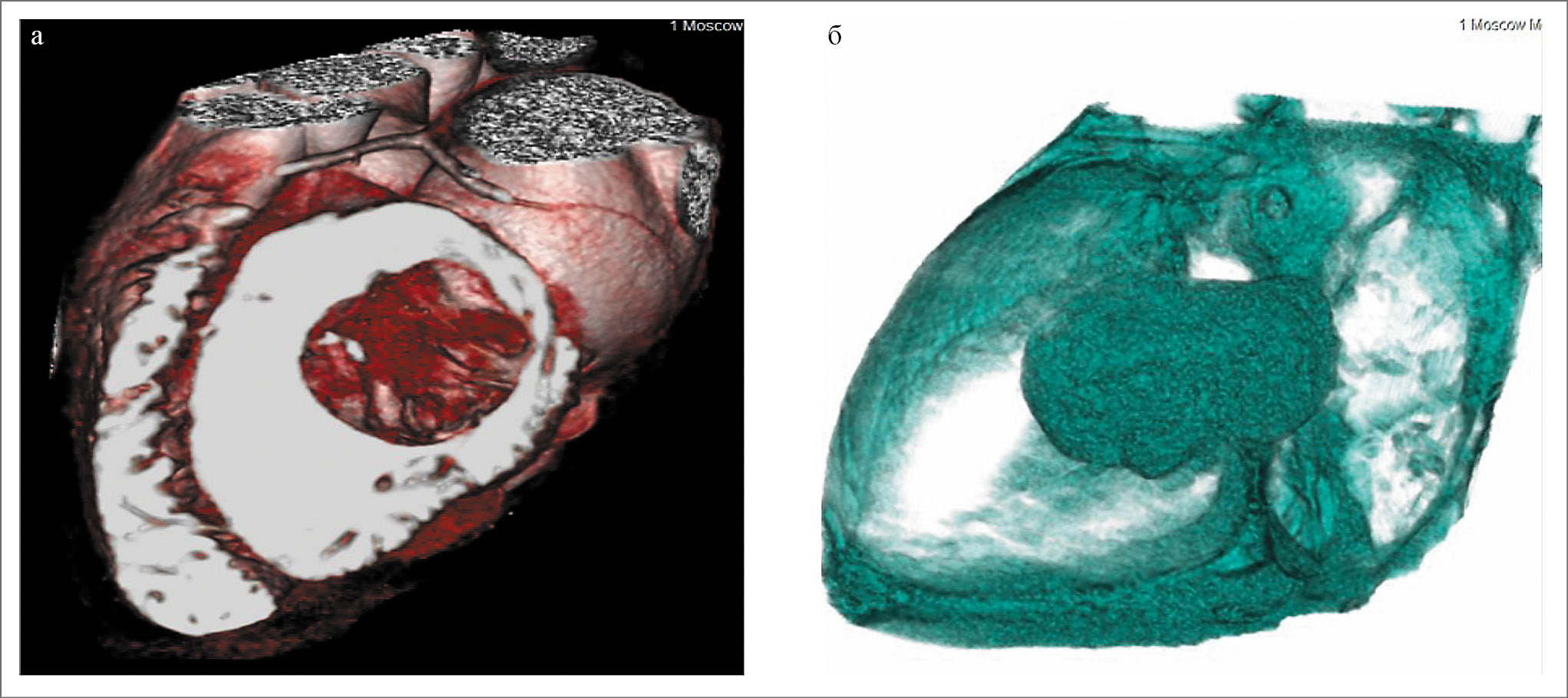 Рис. 3. КТ сердца. Наличие образования неоднородной плотности с четкими контурами размером 62x45 мм на короткой ножке диаметром 14 мм, исходящей из МПП. Образование в диастолу на 2/3 смещается в полость ЛЖ