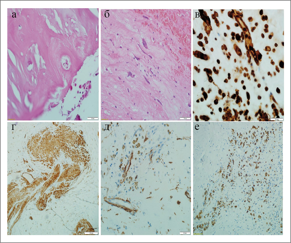 Рис. 6. Гистологическая и иммуногистохимическая характеристика миксомы: а, б – морфология миксомы с некрозом, очаговыми кровоизлияниями, отложениями гемосидерина и кальцинозом; в – исследование на виментин – наличие в составе опухолей фибробластов (типично для миксомы); г – положительная реакция на SMA в пучках гладкомышечных клеток и стенках сосудов; д – негативная реакция на мезенхимальные стволовые клетки АЕ1/АЕ; е – Кi-67 в клетках миксомы