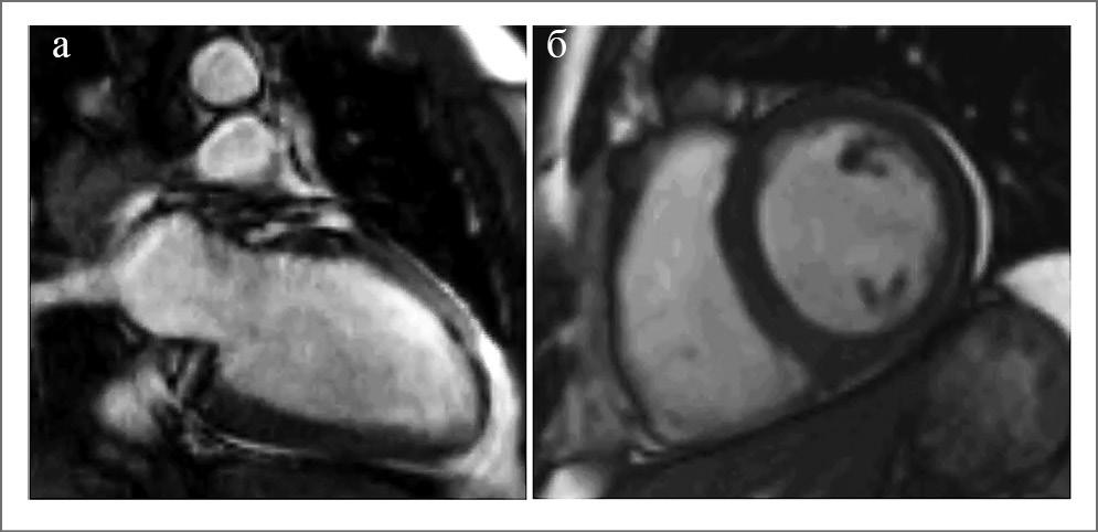 Рис. 2. Кино-МРТ: а – 2-камерная длинная ось ЛЖ; б – 2-камерная короткая ось ЛЖ