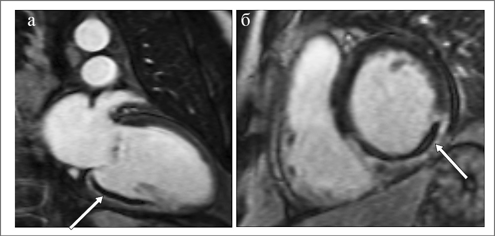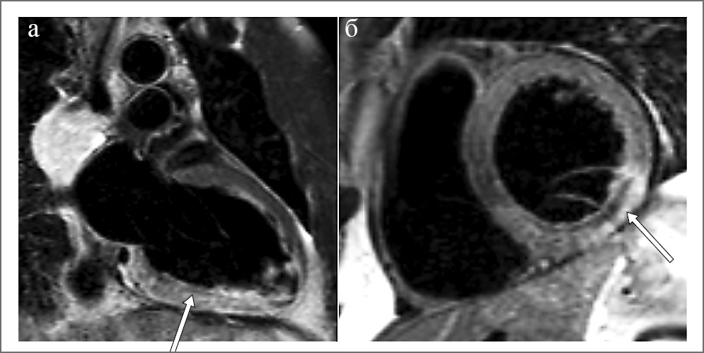 Рис. 4. МРТ с отсроченным контрастированием: а – 2-камерная длинная ось ЛЖ; б – 2-камерная короткая ось ЛЖ. Зона накопления контрастного препарата выглядит яркой, низкоинтенсивная область внутри зоны накопления (указано стрелкой) – участок внутрисосудистой обструкции