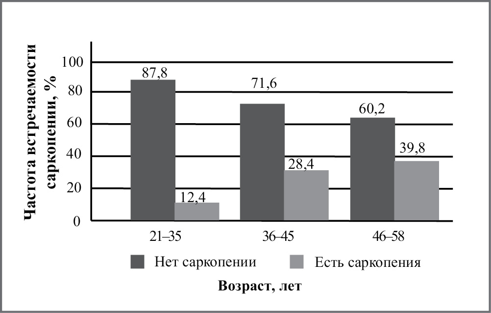 При оценке распространенности саркопении в зависимости от возраста пациентов получены данные, представленные на рис. 1.
