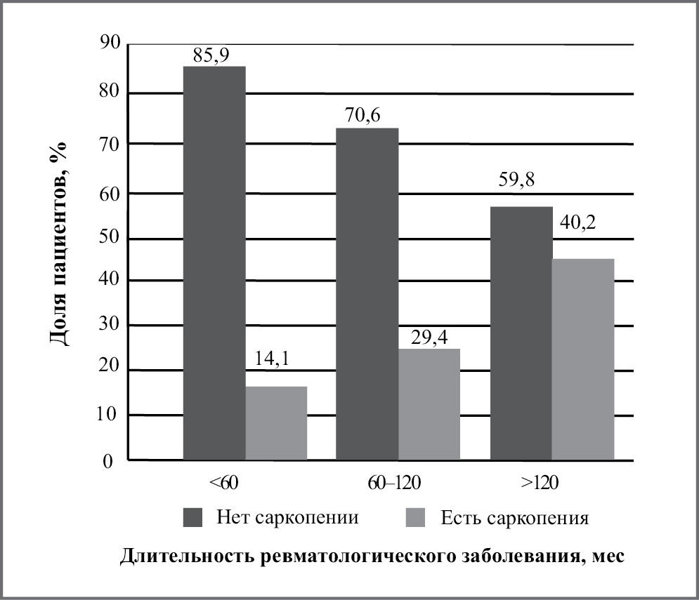 На рис. 2 представлена распространенность саркопении в зависимости от длительности ревматологического заболевания.