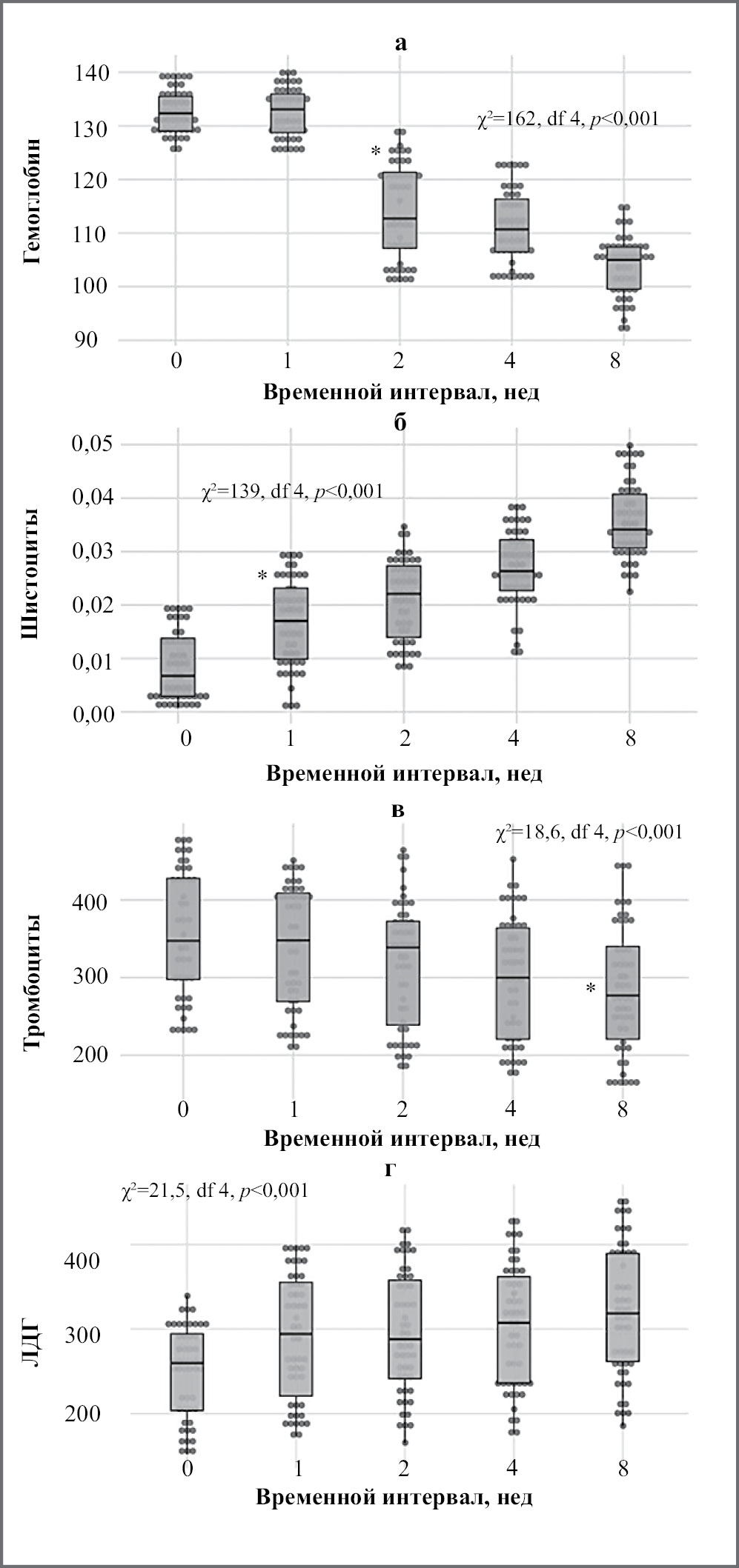 Анемия выявлена у всех 50 пациентов на 8-й неделе лечения антиангиогенными препаратами, при этом снижение гемоглобина ниже 105 г/л наблюдалось у 24 (48%) больных. Медиана гемоглобина во всей выборке пациентов составила 132 [129–136] г/л до начала лечения и 104 [99–107] г/л – через 8 нед лечения; достоверное снижение уровня гемоглобина наблюдалось через 2 нед терапии (рис. 2, а). Также мы наблюдали постепенное увеличение количества шистоцитов к 8-й неделе лечения, хотя их уровень оставался в пределах референсных значений (рис. 2, б). Медиана числа тромбоцитов во всей выборке пациентов составила 347 [292–429]×103/мкл до начала лечения и 276 [216–347]×103/мкл через 8 нед от первого введения антиангиогенного препарата, т.е. выявлено снижение на 21% от начального уровня. Отмечено постепенное повышение уровня D-димера, которое становилось статистически значимым на 8-й неделе терапии (рис. 2, в). Отмечалось также небольшое нарастание ЛДГ – 260 [202–296] Ед/л до начала лечения и 319 [259–390] Ед/л через 8 нед от первого введения антиангиогенного препарата. Достоверными изменения становились через 2 нед с момента начала терапии (рис. 2, г).