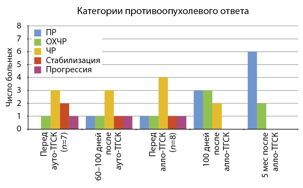 С учетом молодого возраста больных, сохранного соматического статуса, агрессивного течения заболевания в программу лечения 7 больных включены последовательно ауто-алло-ТГСК. Одному пациенту в связи с длительной терапией леналидомидом (15 мес) и, как следствие, большой вероятностью неудачи сбора аутологичных гемопоэтических клеток крови алло-ТГСК выполнена без предшествующей ауто-ТГСК. Пяти больным мобилизация выполнена по схеме циклофосфамид 4 г/м2 + гранулоцитарный колониестимулирующий фактор (Г-КСФ) 5 мкг/кг в сутки, 1 пациенту доза циклофосфамида увеличена до 6 г/м2, в другом наблюдении сбор ГСК крови (ГСКК) осуществлен после курса DHAP (цисплатин, цитарабин, дексаметазон) с последующим введением Г-КСФ. Перед ауто-ТГСК у 1 больного определена очень хорошая ЧР (ОХЧР), в 3 случаях – ЧР, у 2 пациентов отмечалась стабилизация, в 1 наблюдении – прогрессия заболевания. Ауто-ТГСК всем больным выполнена после предтрансплантационного кондиционирования мелфаланом в дозе 200 мг/м2. На рис. 1 представлены категории противоопухолевого ответа до и после этапов высокодозного лечения. Как видно из рис. 1, после ауто-ТГСК противоопухолевый ответ сохранялся недостаточным, полная ремиссия (ПР) и ОХЧР констатированы в единичных наблюдениях. Алло-ТГСК от родственного HLA-идентичного донора выполнена через 2–5,5 мес после ауто-ТГСК (медиана – 5 мес). Семи донорам выполнялась эксфузия костного мозга, костномозговая взвесь содержала от 2,2 до 3,3×108 ядросодержащих клеток/кг (медиана 3×108). В одном наблюдении донору 65 лет выполнена мобилизация ГСК по схеме: Г-КСФ + плериксафор, заготовлено 2,6×106 CD34+ клеток/кг. Предтрансплантационное кондиционирование всем больным проведено в режиме пониженной интенсивности (флударабин 30 мг/м2 × 6 сут + бусульфан 4 мг/кг × 2 сут).