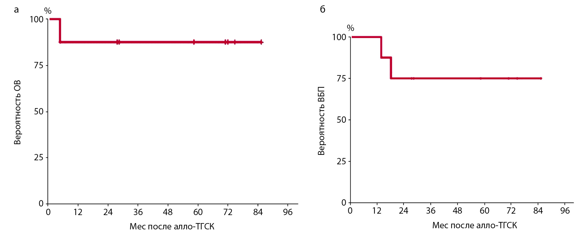Рис. 2. Вероятность ОВ (а) и ВБП (б) больных ММ после алло-ТГСК. / Fig. 2. Probability of overall survival – OS (a) and progression-free survival – PFS (b) in MM patients after allo-HSCT.