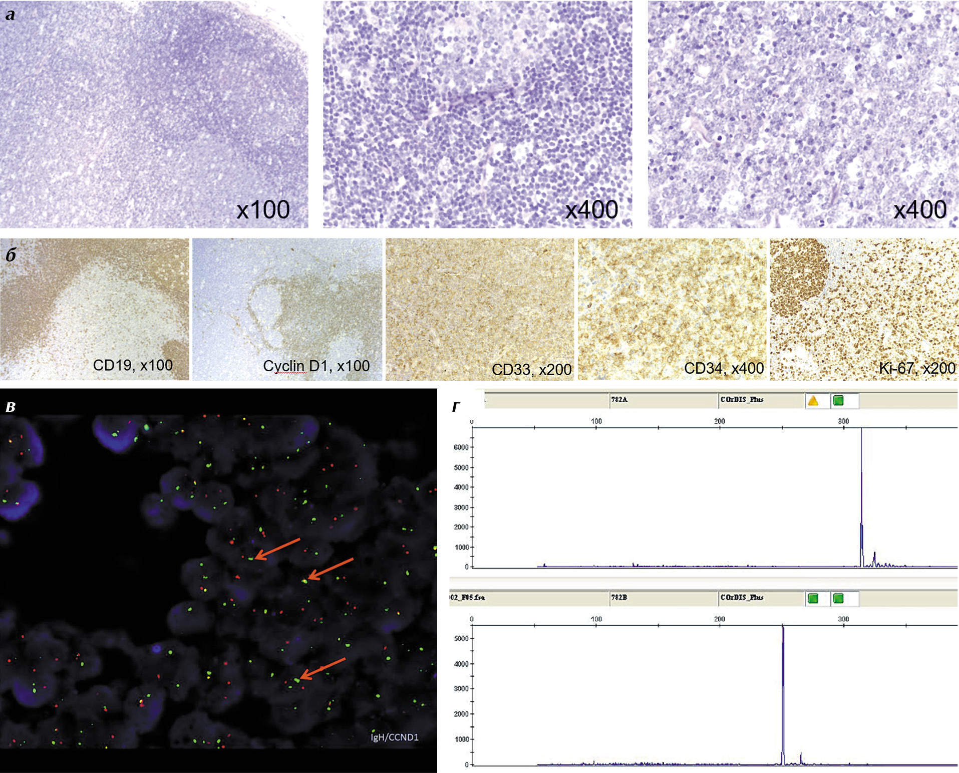 Рис. 1. Гистологическое, ИГХ, молекулярно-генетическое и FISH-исследования, которые демонстрируют первично-множественное опухолевое поражение МС и ЛКМЗ: а – гистологическое исследование ЛУ (окраска гематоксилин-эозином, ×100–400); б – ИГХ-окраска тканей ЛУ (использование антител к CD33, CD34, CD19, cyclin D1, Ki-67, ×100–400); в – анализ клеток КМ с использованием FISH-исследования, ДНК-зонд на IG/CCND1; г – определение В-клеточной клональности по перестройке генов тяжелых и легких цепей иммуноглобулинов в биоптате ЛУ и пунктате КМ. / Fig. 1. Histological, immunohistochemistry, molecular-genetic and FISH examination, which demonstrate primary multiple tumor lesions of myeloid sarcoma and mantle cell lymphoma: a – histological examination of the lymph nodes – LN (hematoxylin and eosin staining, ×100–400); b – IHC staining of the LN tissues (using antibodies to CD33, CD34, CD19, Cyclin D1, Ki-67, ×100–400); c - analysis of bone marrow cells using FISH test, DNA probe for IG/CCND1; d – determination of B-cell clonality by rearrangement of genes of heavy and light chains of immunoglobulins in biopsy specimens of LN and BM punctate.