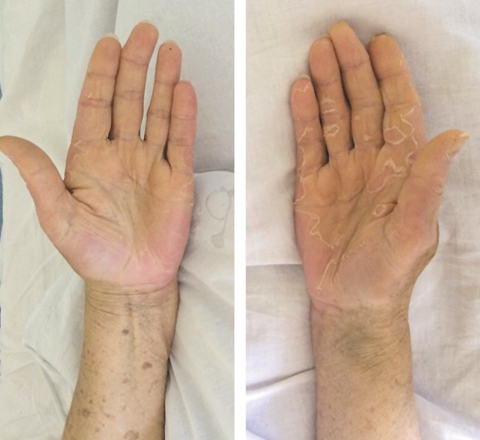Рис. 2. Кожная токсичность в виде эритемы и шелушения кожи ладоней после терапии цитарабином. / Fig. 2. Skin toxicity in the form of erythema and peeling skin on the palms after therapy with cytarabine.