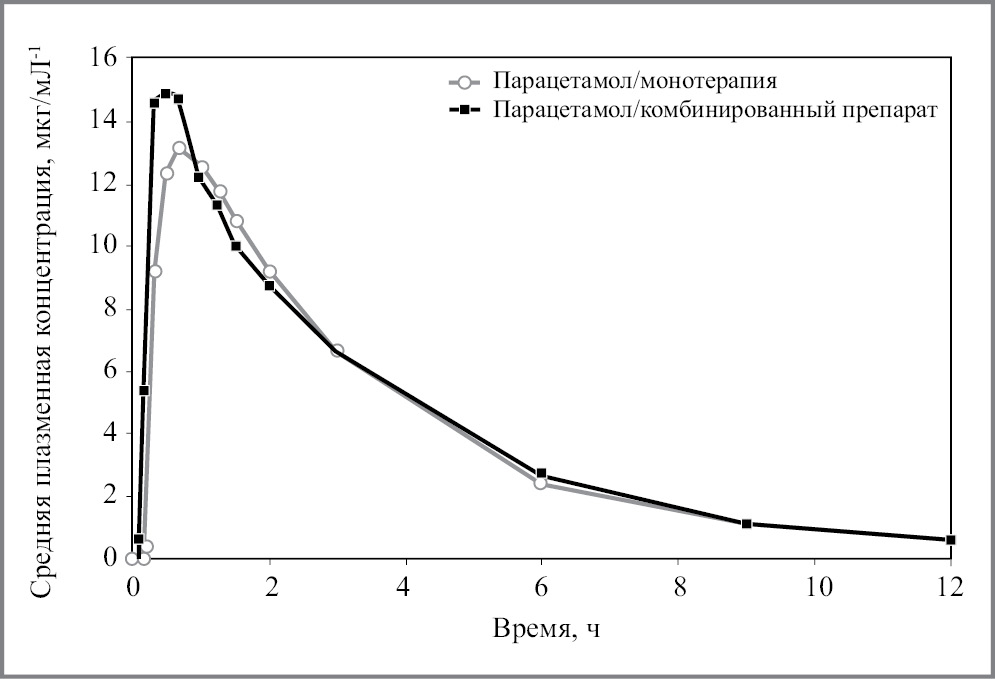 У пациентов, получавших комбинированную таблетку, концентрация ибупрофена в плазме крови через 10 мин составила 6,64 мкг/мЛ-1; через 20 мин – 16,81 мкг/мЛ-1, в то время как при приеме в той же дозе в виде монотерапии соответственно 0,58 и 9,00 мкг/мЛ-1. Аналогичным образом средние концентрации парацетамола в плазме крови через 10 и 20 мин у пациентов, получавших комбинированную таблетку, составили 5,43 и 14,54 мкг/мЛ-1 соответственно по сравнению со значениями 0,33 и 9,19 мкг/мЛ-1 для монотерапии парацетамолом. Таким образом, при приеме парацетамола в составе фиксированной комбинации его концентрация в плазме крови через 10 мин превышала концентрацию при приеме той же дозы в виде монопрепарата в 16,5 раза. Как для ибупрофена, так и для парацетамола выявлена четкая связь между концентрацией в плазме и степенью измеренного анальгетического эффекта. Например, для достижения значимого снижения боли до умеренных значений после тонзиллэктомии необходима концентрация парацетамола 10 мг/л в так называемой эффекторной камере, отражающей концентрацию препарата в месте действия анестетика [34].