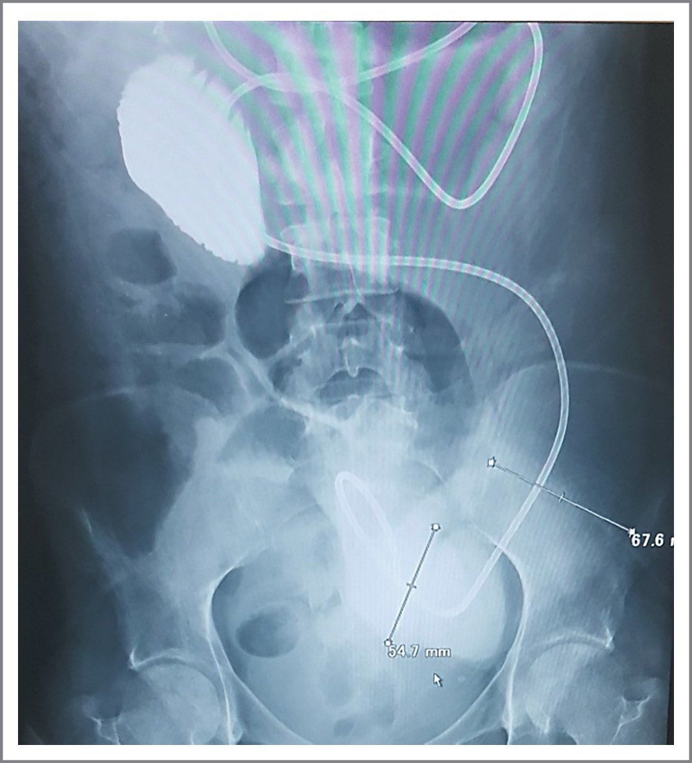 Эффективность терапии оценивали по данным рентгенологического исследования с контрастированием желудочного и интестинального зондов. На протяжении всего периода наблюдения происходило постепенное уменьшение просвета желудка, двенадцатиперстной и начального отдела тощей кишки до 2–2,5 см. Средние и дистальные отделы ТК оставались расширенными до 7 см (рис. 5). Перистальтика отсутствовала на всем протяжении ТК, что подтверждало тяжелую форму интестинальной псевдообструкции. Попытки восстановить моторику ее регуляторами – метоклопрамидом, домперидоном и итопридом не оказывали эффекта. Тегасерод и прукалоприд – селективные агонисты серотониновых рецепторов – вызывали сильные боли в животе и были отменены.