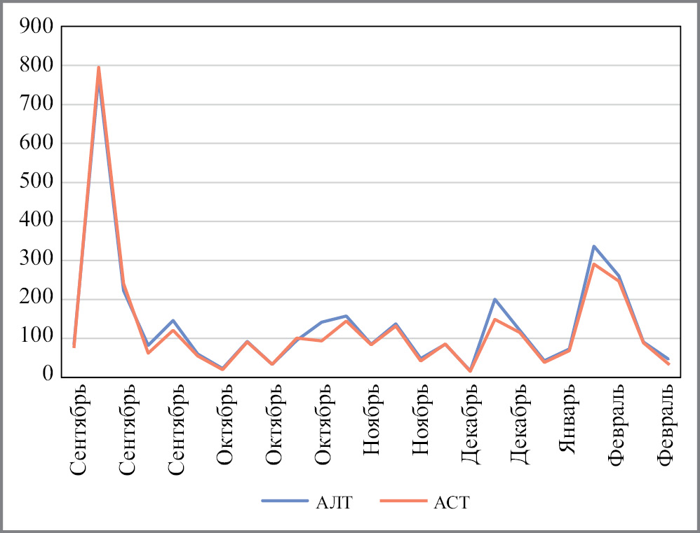 Рис. 6. Активность АЛТ и АСТ у больной А.