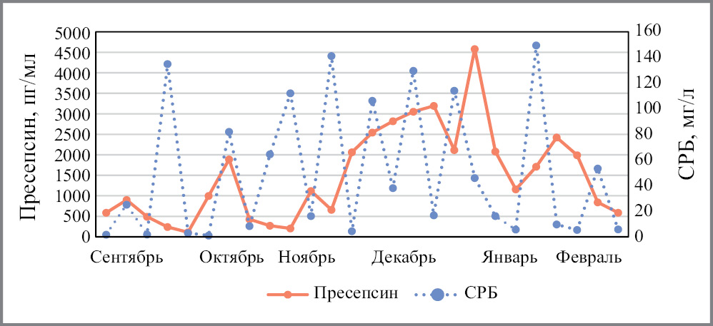 Рис. 7. Концентрация пресепсина и СРБ в крови у больной А.