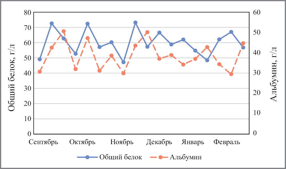 Рис. 8. Концентрация альбумина и общего белка в крови у больной А.