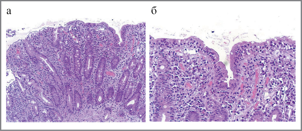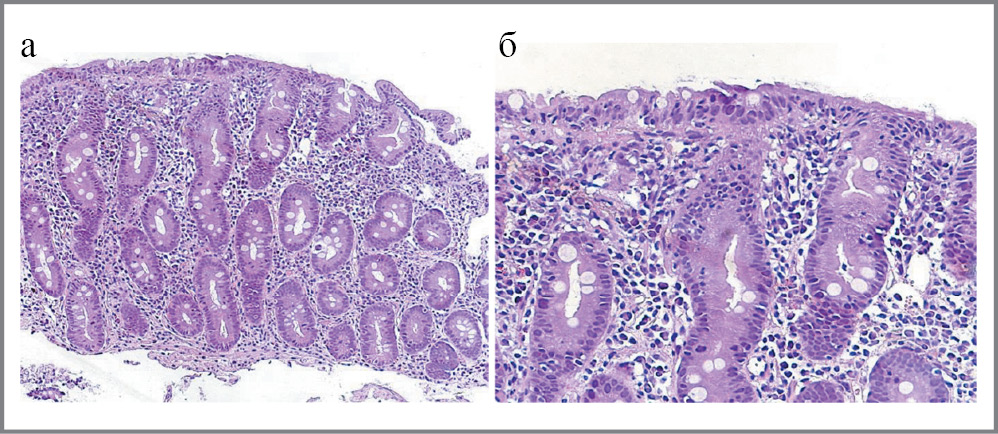 Рис. 1. Гистологическая картина слизистой оболочки двенадцатиперстной кишки при первичном обследовании: а – кишечные ворсины отсутствуют; крипты глубокие; количество бокаловидных клеток в эпителии крипт снижено; собственная пластинка сильно инфильтрирована лимфоцитами и плазмоцитами, ×120; б – число межэпителиальных лимфоцитов существенно увеличено; окраска гематоксилином и эозином, ×300.
