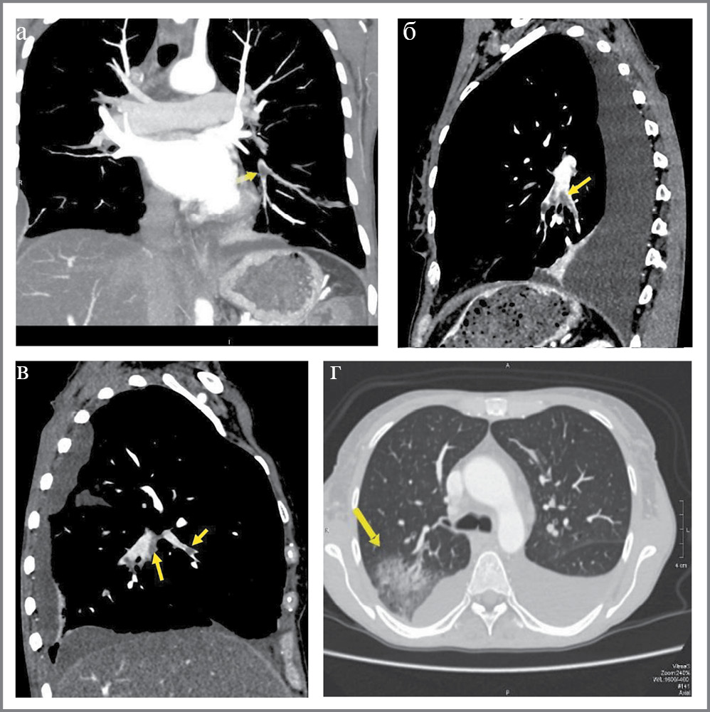 а – мультипланарная реконструкция, корональная плоскость, дефект контрастирования (тромбоэмбол) в просвете левой нижнедолевой легочной артерии и ее сегментарных ветвях (стрелка); б – мультипланарная реконструкция, сагиттальная плоскость, дефект контрастирования (тромбоэмбол) в просвете левой нижнедолевой легочной артерии и ее ветвей (стрелка); в – мультипланарная реконструкция, сагиттальная плоскость, дефект контрастирования (тромбоэмбол) в просвете правой нижнедолевой легочной артерии и ее ветвей (стрелка); г – аксиальная плоскость, легочное электронное окно, зона консолидации легочной ткани – инфаркт-пневмония (стрелка) и дефект контрастирования (частично реканализированный тромбоэмбол) в задней сегментарной ветви верхнедолевой легочной артерии.