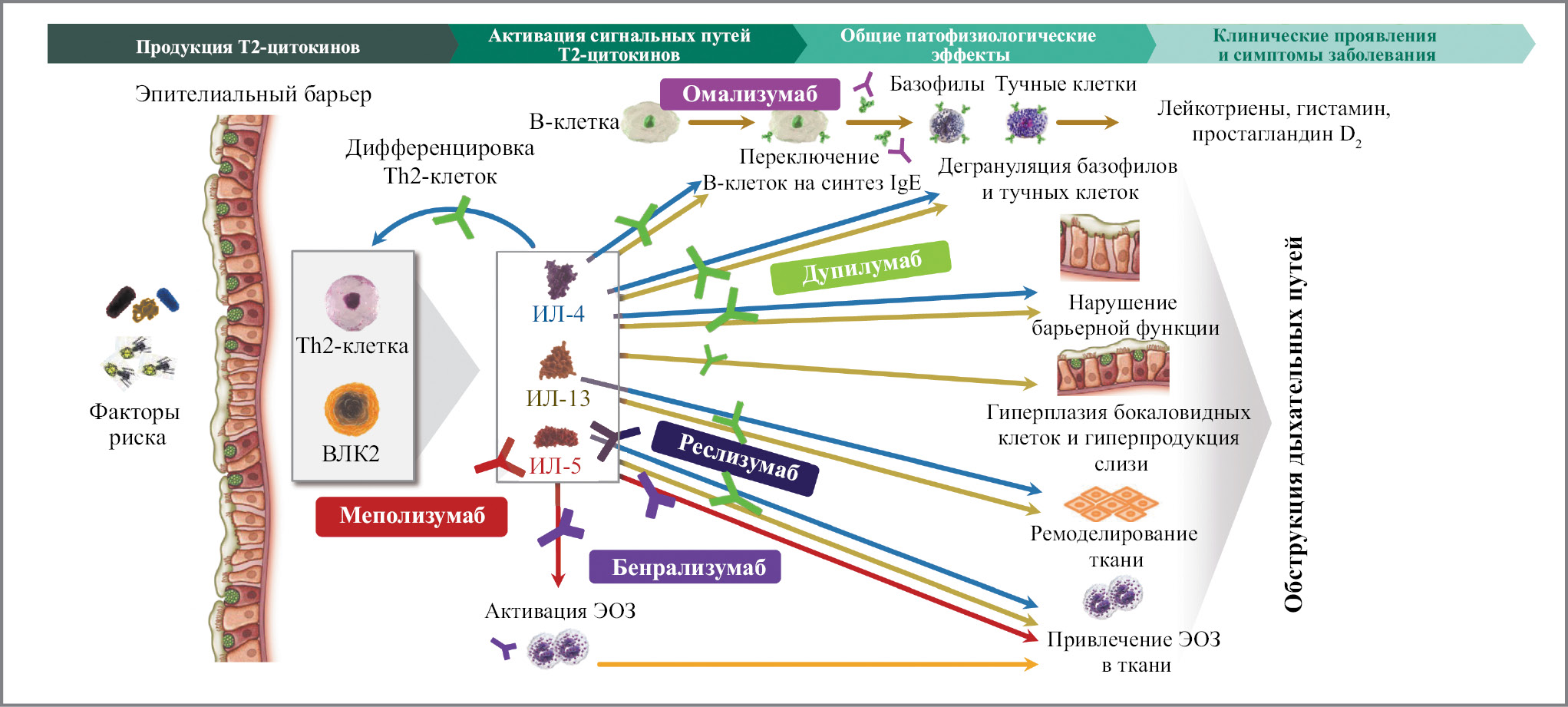 В популяции пациентов с аллергической и эозинофильной БА, протекающей по Т2-эндотипу, к ним относятся блокаторы IgE, ИЛ-5/ИЛ-5R, ИЛ-4R [1, 3, 6, 10].