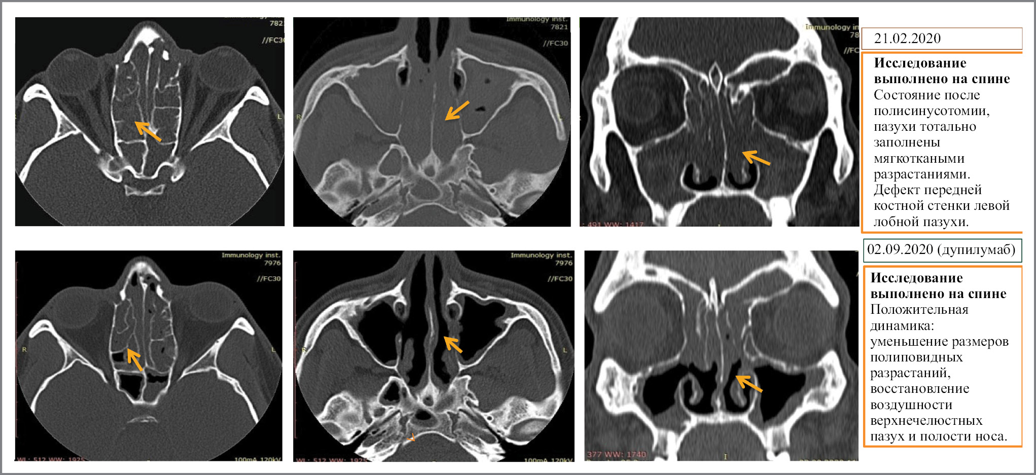 Через 2 нед при риноскопии видно резкое сокращение полипов в объеме в обеих половинах носа, больной получил возможность дышать левой половиной носа, существенно улучшилось дыхание через правую половину уже после одной инъекции. Через 2 мес отмечено дальнейшее сокращение полипов. Через 3 мес после начала терапии дупилумабом пациент отметил существенное улучшение по всем симптомам заболевания: восстановилось носовое дыхание, обоняние, значительно уменьшились выделения из носа, включая постназальный затек.