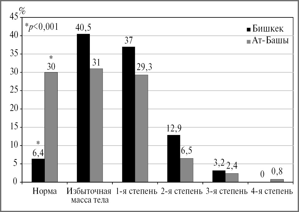 2. Рис. 1. Структура ожирения жителей низкогорья и среднегорья по данным ИМТ.