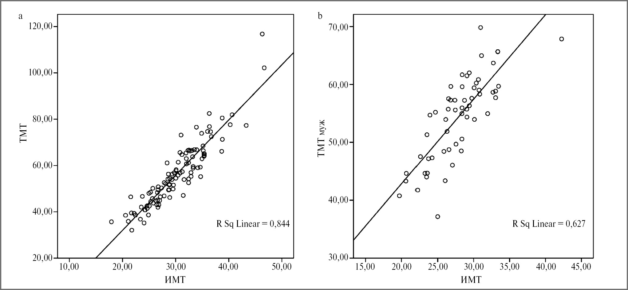 Рис. 2. Корреляция ТМТ и ИМТ: а – у женщин; b – у мужчин.