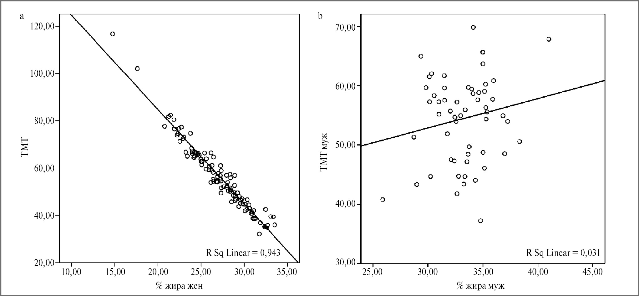 Рис. 3. Корреляция ТМТ и процента жира: а – у женщин; b – у мужчин.