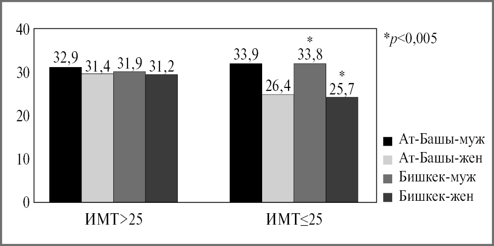 Материалы и методы. Исследование проводилось в рамках проекта «Этиопатогенетические особенности и темпы развития неалкогольной жировой болезни печени (НАЖБП) в условиях Кыргызстана» (№ госрегистрации МЗН/ТЗ-2020-3). Проведено открытое сравнительное исследование больных двумя формами НАЖБП: жировой гепатоз и неалкогольный стеатогепатит (n=236), проживающих в условиях низкогорья (г. Бишкек, высота над уровнем моря – 750–800 м; n=111) и среднегорья (Ат-Башинский район, Нарынская область, высота над уровнем моря – 2046–2300 м; n=125) Кыргызстана. Учитывая, что генетические факторы могут играть роль в развитии НАЖБП, анализировалась популяция, представленная только этническими кыргызами. Средний возраст больных составил 55,7±0,95 года. В каждой группе больных рассматривались худая (индекс массы тела – ИМТ23) и тучная (ИМТ>23) группы. Для определения физической активности применен опросник физической активности, который составлен на основе материалов International Physical Activity Prevalence Study www.ipaq.ki.se. Физикальное обследование включало в себя измерение антропометрических параметров (рост, масса тела, окружность талии), расчет ИМТ, тощей массы тела, процента жира в организме. Согласно градациям Всемирной организации здравоохранения оценивали степени ожирения по ИМТ для азиатов. Забор образцов крови для исследований производился утром натощак после не менее чем 12 ч голодания. Производилось определение следующих показателей: глюкозы, липидного спектра (общего холестерина, холестерина липопротеидов высокой плотности, холестерина липопротеидов низкой плотности, триглицеридов), уровней аланинаминотрансферазы (АЛТ), аспартатаминотрансферазы (АСТ). В качестве предиктора для оценки развития фиброза печени у больных НАЖБП использована шкала BARD. Система подсчета баллов включала три переменные: ИМТ, АСТ/АЛТ и наличие сахарного диабета 2-го типа. Диагноз НАЖБП ставился на основании анамнеза, лабораторных исследований, ультразвукового исследования печени и исключения других заболеваний печени. Анализ полученных результатов проводили с помощью статистического пакета прикладных программ SPSS 16.0 для Windows. Значение p<0,05 считалось статистически значимым при уровне достоверности 95%.