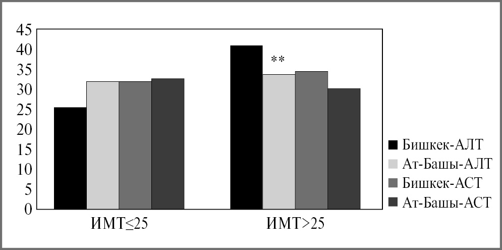 Рис. 5. Уровни АЛТ и АСТ жителей низкогорья и среднегорья с различной массой тела.