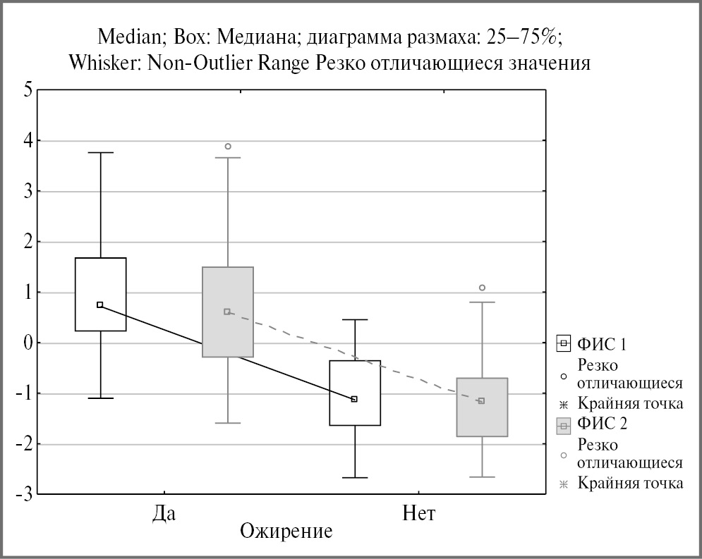 ФИС оказался статистически значимо выше у пациентов с ожирением – 0,7 (0,2–1,7) против -1,13 (-1,6–0,4) у пациентов без ожирения (рис. 1). В динамике на фоне проводимой терапии этот показатель значимо снизился в обеих группах.