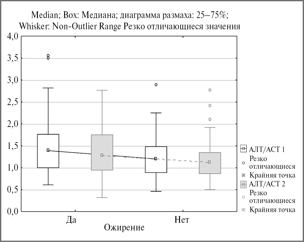 Отношение АЛТ/АСТ статистически значимо оказалось выше у пациентов с ожирением – 1,4 (1,0–1,8) против 1,2 (0,9–1,5) у пациентов без ожирения (рис. 2). В динамике отмечалась тенденция к уменьшению этого показателя.