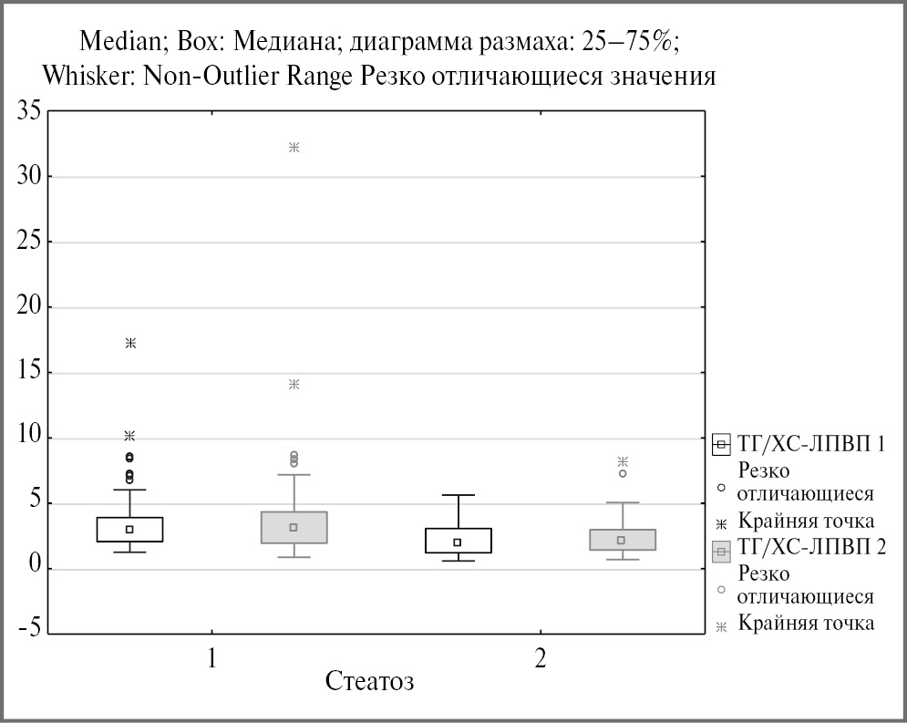 Соотношения ТГ, холестерина липопротеидов низкой плотности (ХС-ЛПНП) и ХС-ЛПВП оказались статистически значимо повышены в группе с ожирением, что еще подтверждает наличие у этих пациентов нарушения липидного обмена.