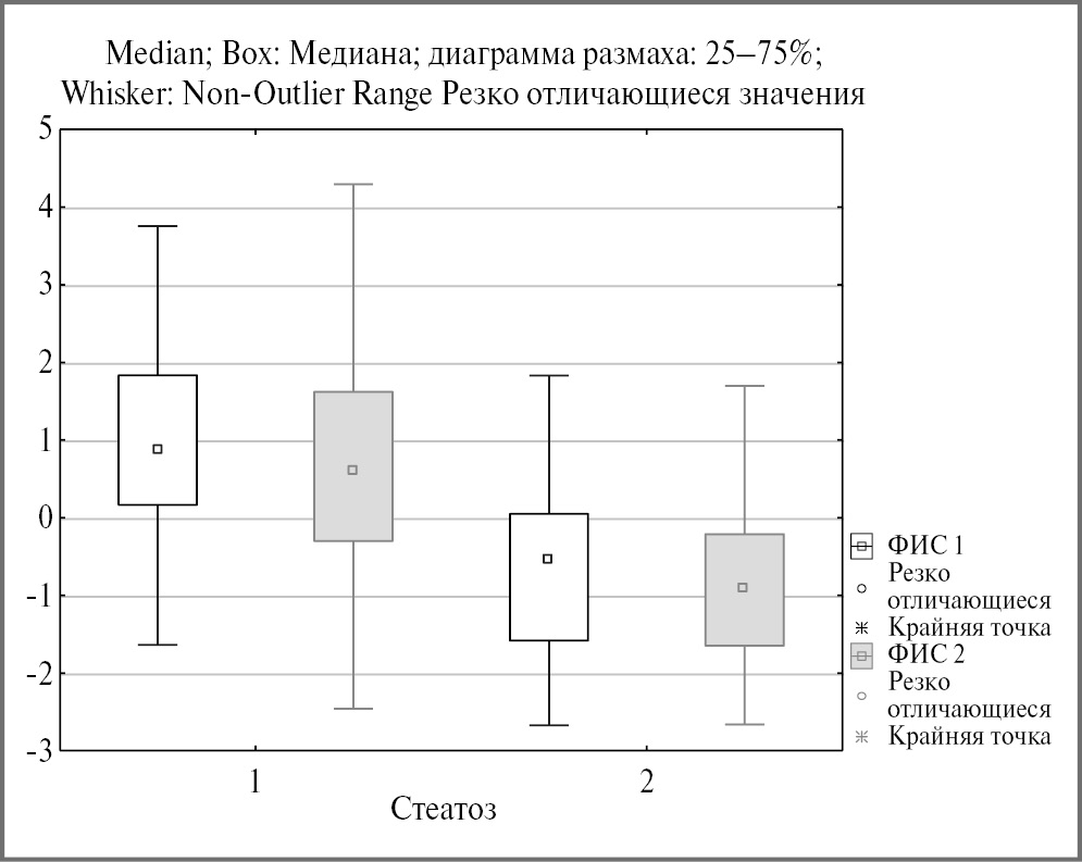 Наиболее интересные результаты получены при подсчете ФИС и соотношения АЛТ/АСТ. Оба этих показателя оказались статистически значимо выше у пациентов с ожирением, что можно в дальнейшем использовать для выявления НАЖБП без использования инвазивных и дорогих исследований.