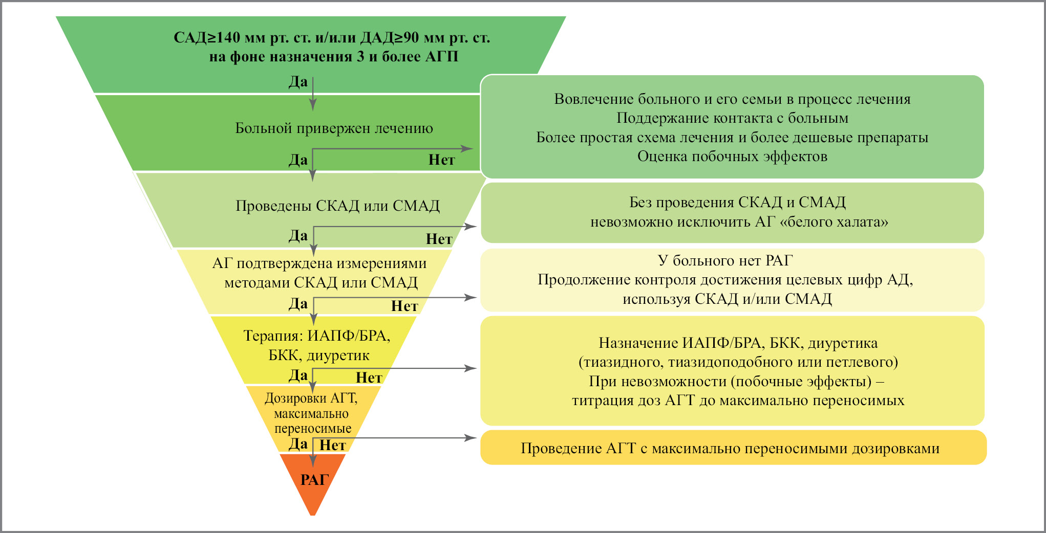 Для диагностики РАГ необходимо исключить наличие псевдорезистентности: состояний, маскирующих АГ под РАГ при соответствии уровня АД и количества принимаемых АГП определению РАГ. В порядке обычной диагностической последовательности эти состояния включают: