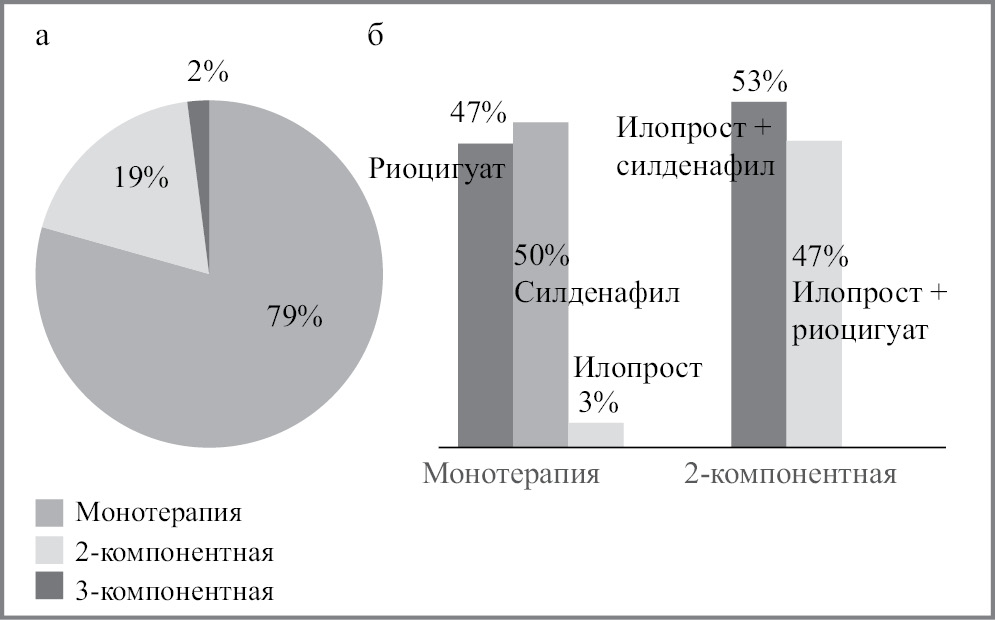 В патогенезе неоперабельных форм ХТЭЛГ важную роль играет дистальная васкулопатия за счет дисфункции эндотелия, когда включаются характерные для ИЛГ патофизиологические механизмы [16, 17]. ХТЭЛГ представляет собой особую, потенциально излечимую с помощью хирургического лечения – операции ТЭЭ – патологию. Патогенетическая терапия направлена на улучшение клинического состояния, переносимости физических нагрузок и гемодинамических показателей, замедление темпов прогрессирования заболевания, улучшение прогноза. Однако у пациентов с неоперабельной ХТЭЛГ имеется очевидный дефицит доказательный базы. За последние 10–15 лет проведено несколько пилотных и рандомизированных контролируемых исследований, которые продемонстрировали возможность различных ЛАГ-специфических препаратов улучшить толерантность к физическим нагрузкам и гемодинамические параметры у лиц с неоперабельной формой ХТЭЛГ [14, 16–24]. В настоящее время в качестве препарата 1-й линии для терапии неоперабельных и резидуальных форм ХТЭЛГ рассматривается единственный препарат из класса стимуляторов растворимой гуанилатциклазы риоцигуат, что основано на доказательной базе рандомизированного контролируемого исследования CHEST-1 и длительного исследования CHEST-2 [18, 20]. Большинство пациентов (66%) принимали ЛАГ-специфическую терапию, причем 14% – комбинированную терапию.