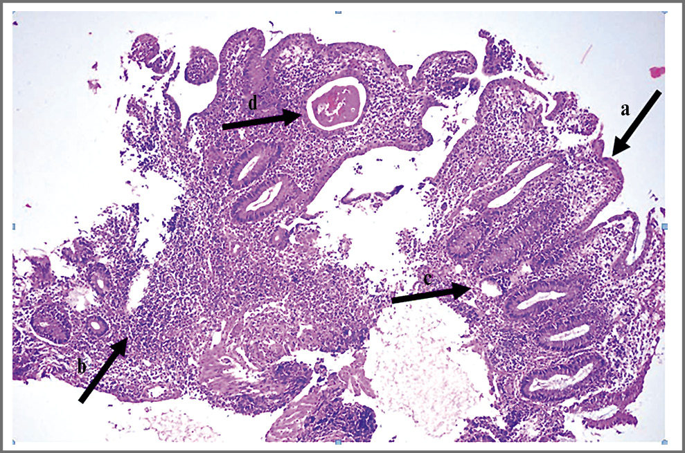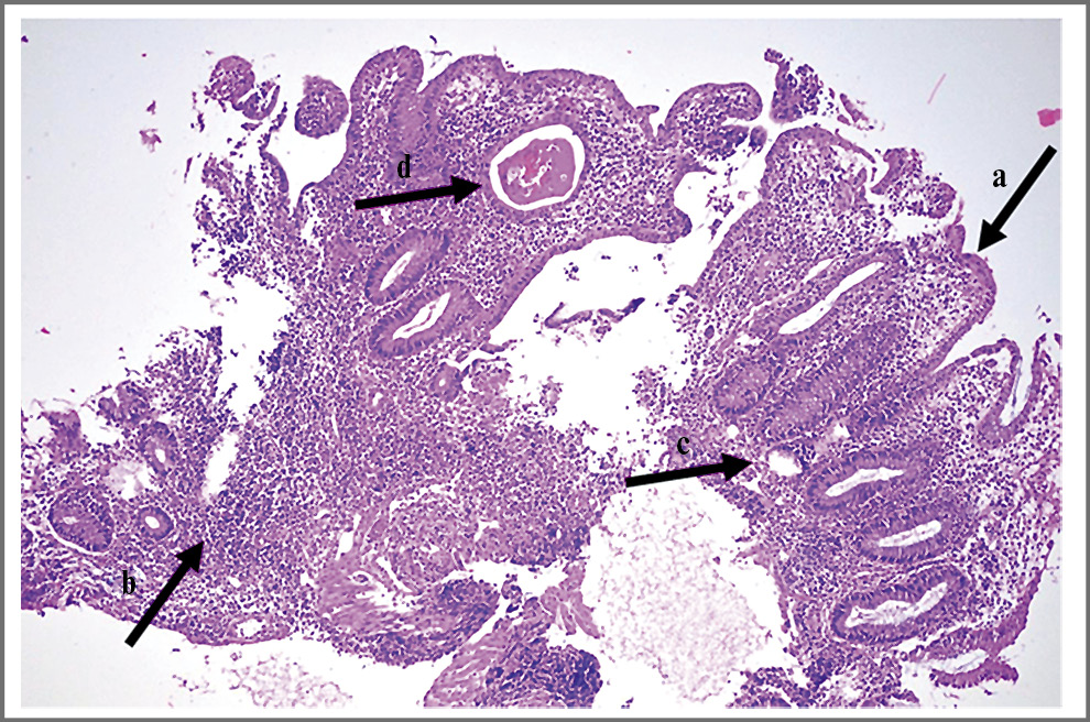 Рис. 5. Фрагмент слизистой оболочки толстой кишки с очаговым некрозом поверхностного эпителия. Покровный эпителий частично представлен незрелыми регенерирующими эпителиоцитами, лишенными муцина (a). Плотный инфильтрат, состоящий из лимфоцитов и плазматических клеток, нейтрофильных лейкоцитов в пределах слизистой оболочки (b) и поверхностных отделах подслизистого слоя; наличие небольших эрозий меду криптами (c). Железы с кистозным расширением (d) и наличием в просвете гомогенного содержимого с примесью лейкоцитов; формирование крипт-абсцессов. Окраска гематоксилином и эозином ×200.