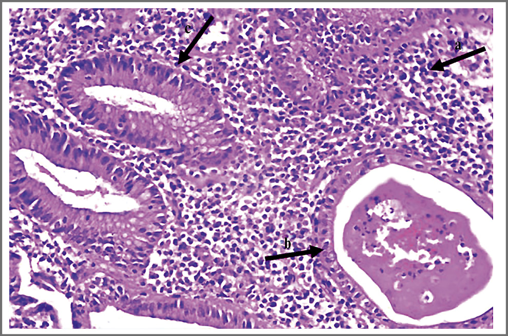 Рис. 2. Фрагмент слизистой оболочки толстой кишки при большом увеличении, с выраженной полиморфноклеточной воспалительной инфильтрацией (a), отеком, железы толстой кишки с частичным нарушением архитектоники, некоторые из них с кистозным расширением, наличием в просвете гомогенного содержимого с примесью лейкоцитов (b), уменьшение числа бокаловидных клеток (c). Окраска гематоксилином и эозином ×400.